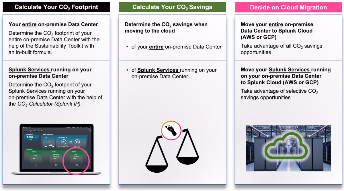 Obviously, not all organizations choose to move their entire data center to the cloud for many valid reasons, resulting in a hybrid cloud strategy. In that case, they can still take advantage of selective CO2 savings opportunities when they move their Splunk Services to the cloud. On top of that, they can optimize their on-premise data center with the insights gained by the Sustainability Toolkit.