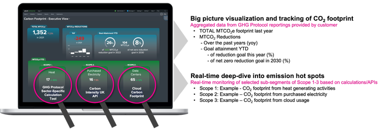 On the other hand, it empowers organizations to deep-dive into emission hot spots in real-time and take the required action based on data. Such hot spots would be sub-segments of Scope 1-3 of the GHG Protocol. In the example dashboard above these would be direct emissions from heat originating e.g. from the combustion of fuels, purchased electricity (Scope 2) and emissions from running data centers (Scope 3).