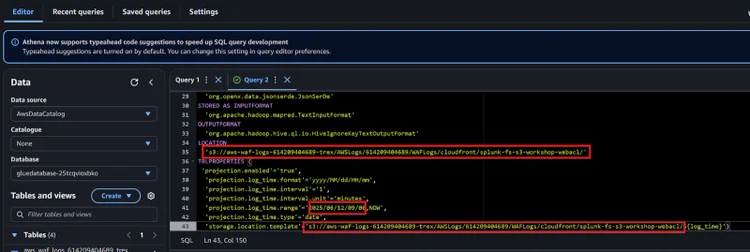 - The DDL code example below is for the Amazon CloudFront WebACL example. The DDL for other non CloudFront examples may be needed for it to work in your setup.