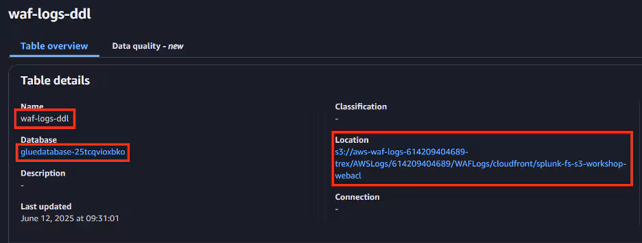 Once completed navigate to AWS Glue and click on our new table waf-logs-ddl as we will need the information from this screen for our next step. See example below