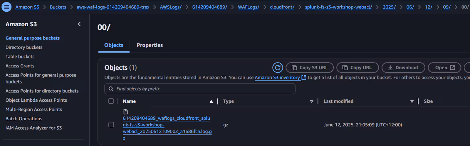 - <FIRST DATE IN S3> - This is where you navigate in the S3 folders until you get to the first date and time of your log file. E.g. 2025/06/12/09/00 (see example below):