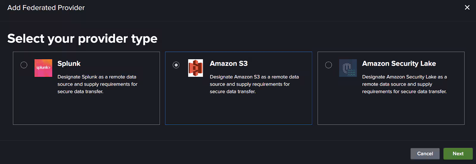 2. Click the Add federated index, followed by For S3 provider buttons.