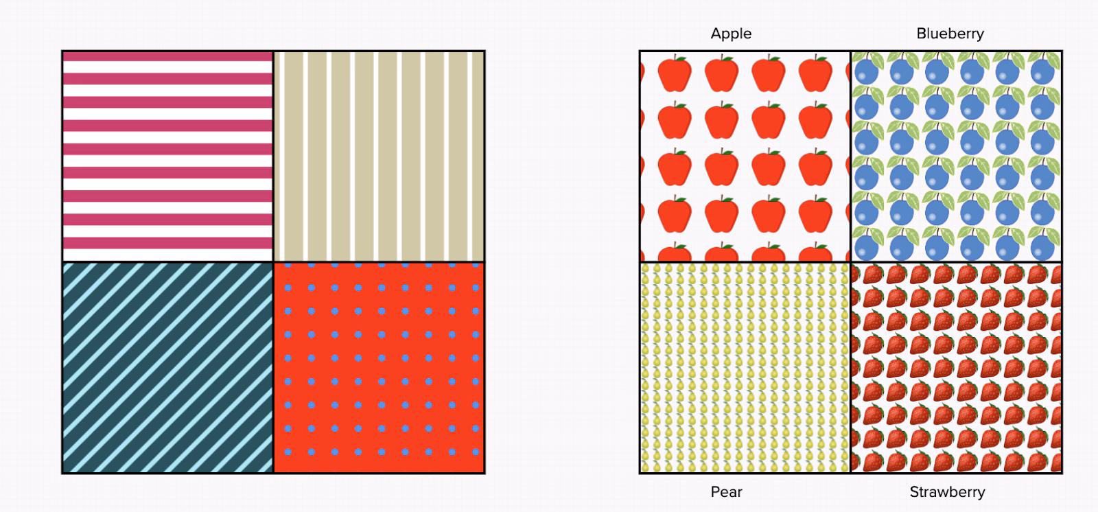 As we move towards these more advanced dashboarding frameworks where possibilities are endless, we have the freedom to create anything. With that power, comes great responsibility. It is that much easier to distinguish one pattern from another when using colors and so you should always consider that for your dashboard viewer. Though I think monochromatic pattern fills look really interesting, it doesn't mean it's going to be accessible for your viewers, so please keep this sort of thing in mind. That being said, if you really want to set your dashboard apart and not stick to just stripes and dots, why not try on some of your favorite fruits?