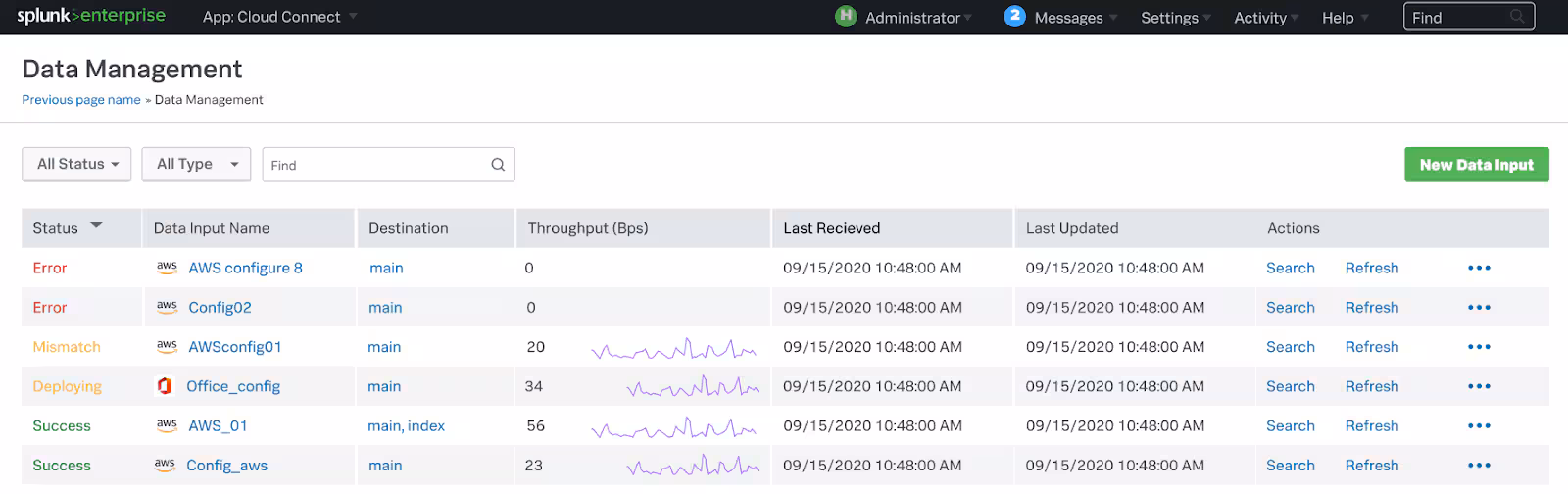 The screenshot below shows how you can manage data onboarding for AWS sources from a single pane of glass: