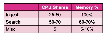 We recommend the following resource allocation for each category. Given that Splunk core processes run in the Ingest category, set the memory limit to 100%. The resource allocation can be different for indexers and search heads if they have vastly different CPU and memory resources or if the ingestion rate is high.