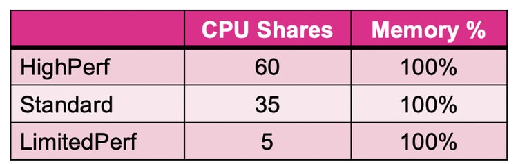 The Search category can be further divided into various pools. If you are creating a workload pool for high priority searches, allocate 60-70% CPU resources. Memory can be shared across all search pools. Below is a typical resource allocation. You should be very selective in assigning searches to your high priority pool. We recommend adding no more than 10-20% of your total search volume assigned to your high priority pool, otherwise it will lose its ‘high priority’ nature.