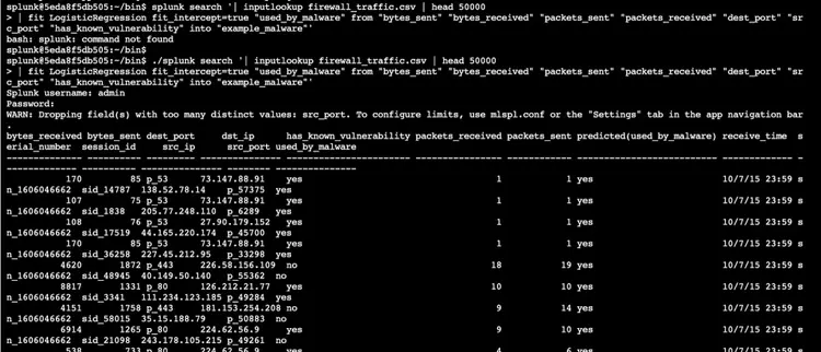 | fit LogisticRegression fit_intercept=true "used_by_malware" from "bytes_sent" "bytes_received" "packets_sent" "packets_received" "dest_port" "src_port" "has_known_vulnerability" into "example_malware"'
