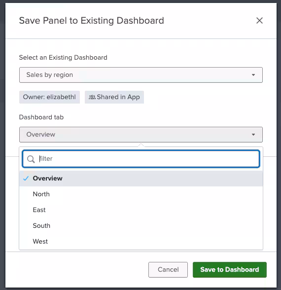 It is also now possible to select which tab you want to land on when saving a visualization from search or linking to a dashboard with tabs. When saving a visualization from search, you will see an updated modal which allows you to browse existing dashboards via keyword search, view the owner and permissions of the dashboard, and select a tab, when applicable.