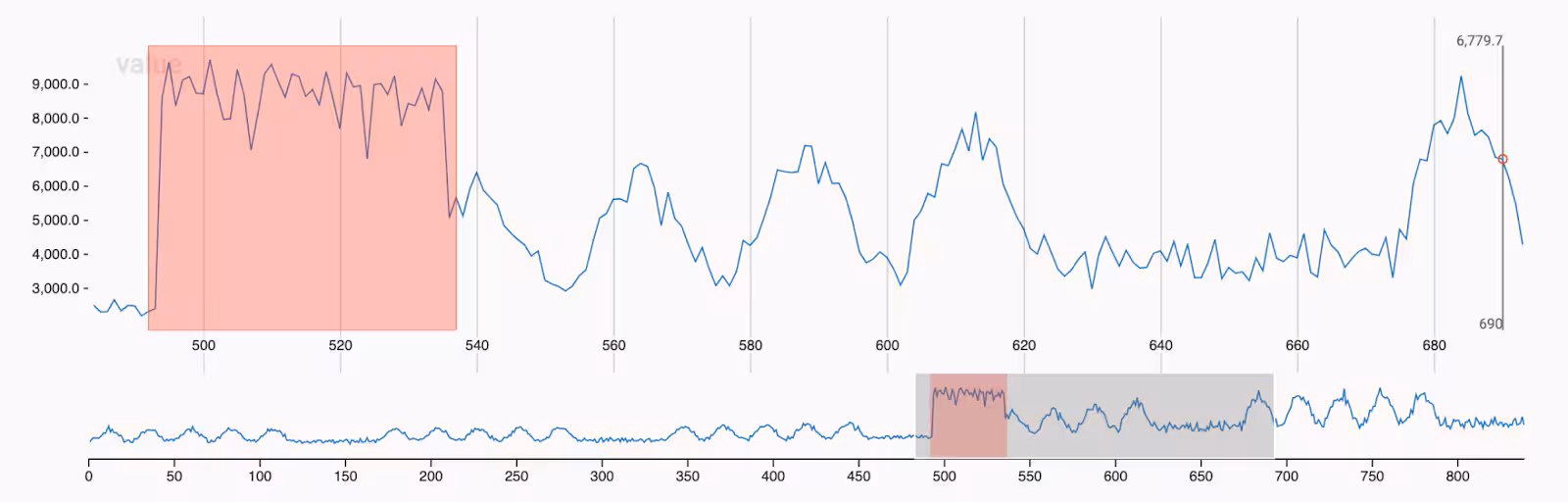 The evaluation suite currently contains 200 time series spanning a variety of both internal and external sources. These sources were chosen under the criteria of being domain-specific and representative of the types of time series that we expect customers to bring to the app, while also covering a broad variety of characteristics and different types of anomalies (e.g. contextual, seasonal, frequency, spike, and drift anomalies). While most of the the externally-sourced datasets came with explicit anomaly labels, we were responsible for labeling the internally-sourced data ourselves; to do so, we leveraged Label Studio in order to label regions of anomalous behavior (using a consensus protocol across multiple labelers) in the time series.