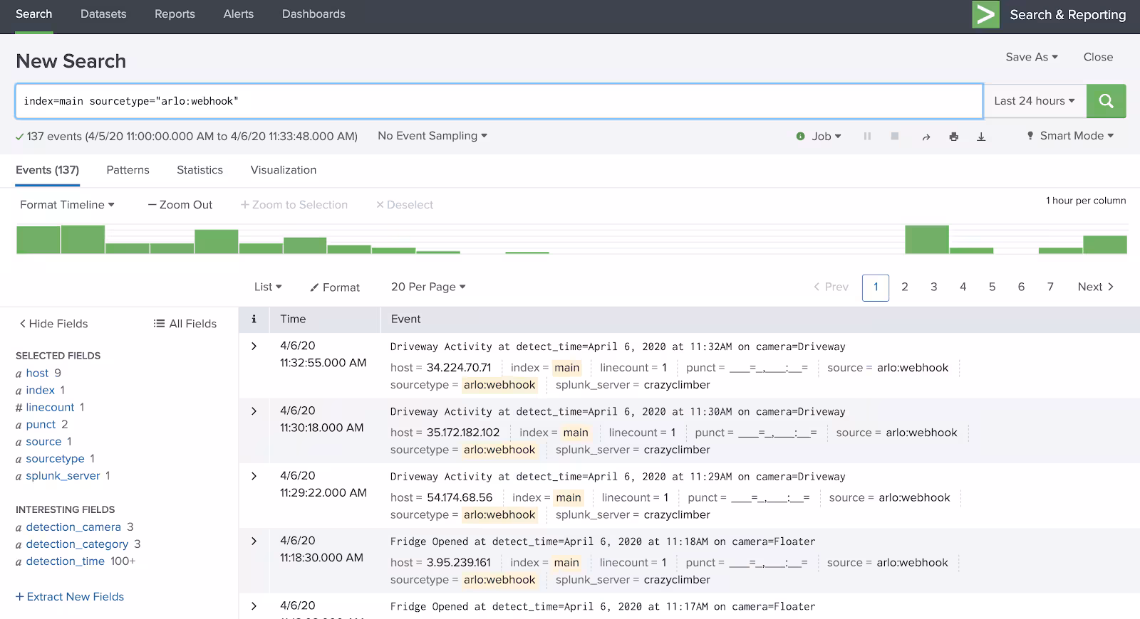 How can you create your own magic? All you need is a camera system that logs its activity when it senses motion — the more detailed the information the better3. Arlo cameras, for example, can identify if an object seen is an animal, or a person, or a vehicle. The activity should be in some time-stamped format that can be consumed in Splunk — a flat-file written to a server, an email notification that Splunk Phantom could parse, data retrievable via API call, or in Arlo’s case (and what I did…) an IFTTT applet that triggers an HTTPS post via webhook to Splunk’s HTTP Event Collector! (Thanks for the tip, Cody!)