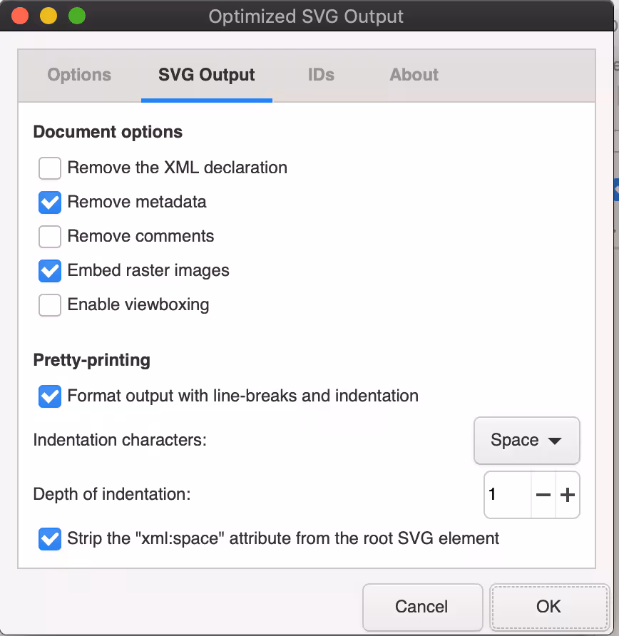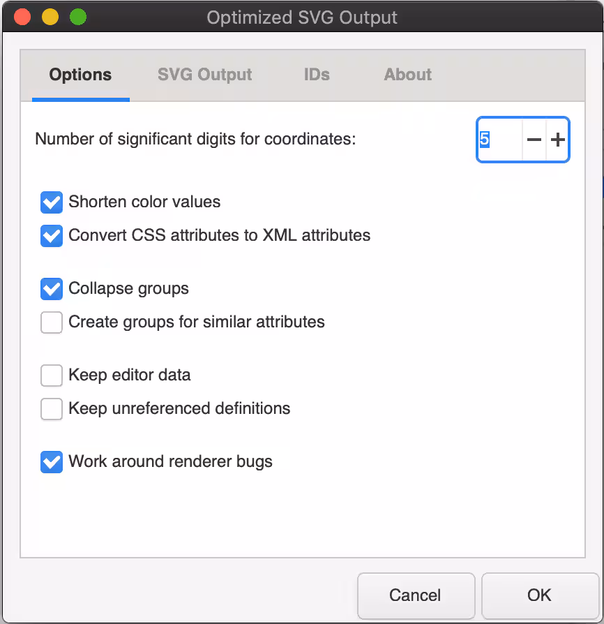 - You’ll want to select your “File Type” as an Optimized SVG. Here are the parameters I typically use. Again, this may not be a one-size fits all, but it’s a great start.