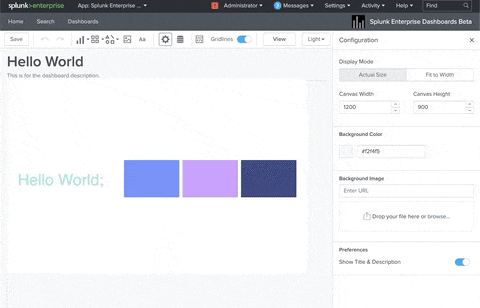 Tying your newly created SVG to a Splunk Dashboard is where the rubber meets the road for “painting with data.” Assuming you already know how to create visualizations like line charts, barcharts, and other Objects inside of the new Splunk Dashboard framework — you’ll be picking up SVGs in no-time. With a little practice, these visualizations become second nature, and extremely compelling. Below you’ll find a GIF of how to create one of these very basic SVG visualizations.