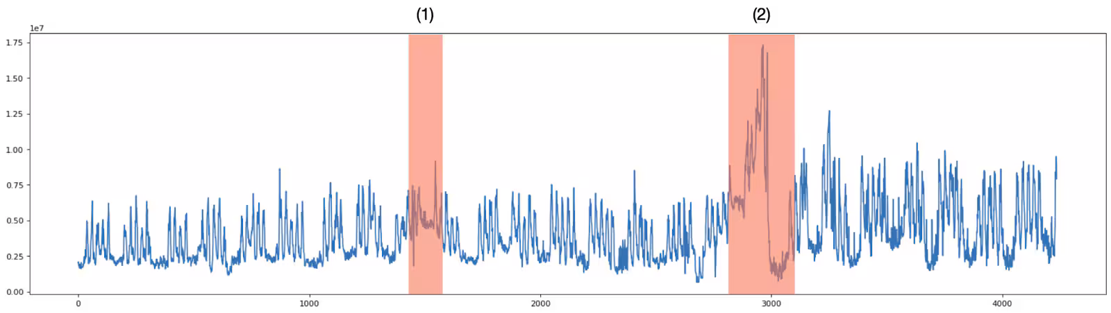 To give an example of what both of these anomalies look like in the real world - not in synthetic data - we looked through Splunk’s internal usage. It didn’t take too long to find scenarios where ingestion errors had occurred, and we can label the corresponding parts of the ingest function produced by an internal application.