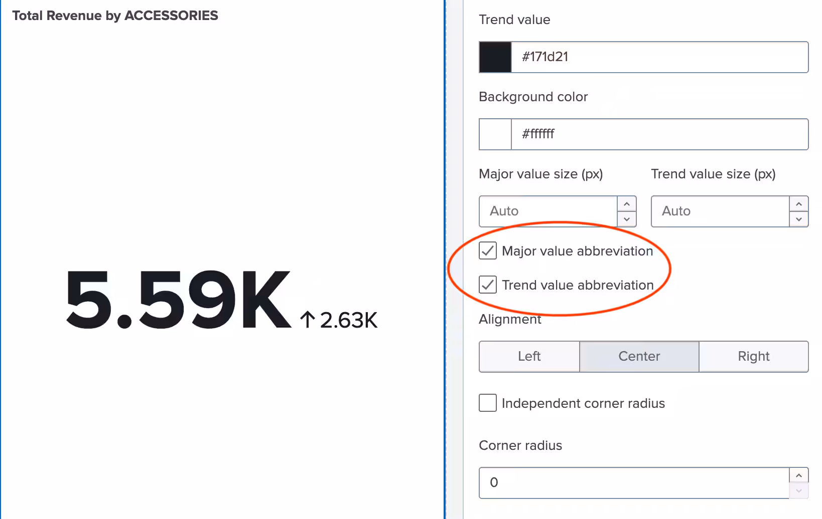 Single value visualizations now have the option to abbreviate both their major and trend values from the configuration panel.