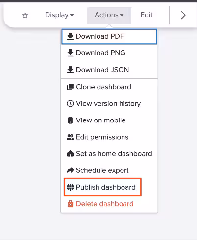 Once your dashboard is published, you can preview it by selecting "View published dashboard". For more detailed management options—such as viewing the published link, adjusting the refresh schedule, viewing the expiry date, or deleting the published link—navigate to "Publish options". This modal can also be accessed through the "Publish dashboard" option in the “Actions” dropdown list of your published dashboard.