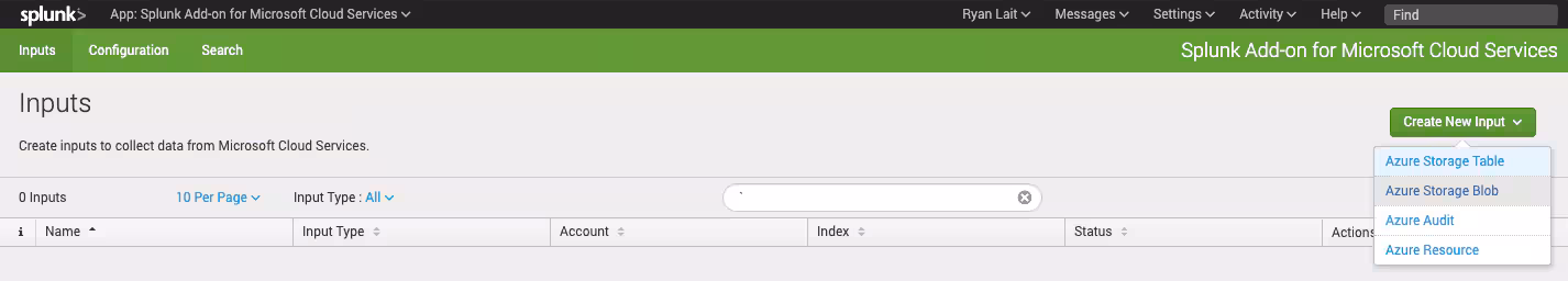 10. Splunk Add-on for Microsoft Cloud Services > Inputs > Create New Input > Azure Storage Blob