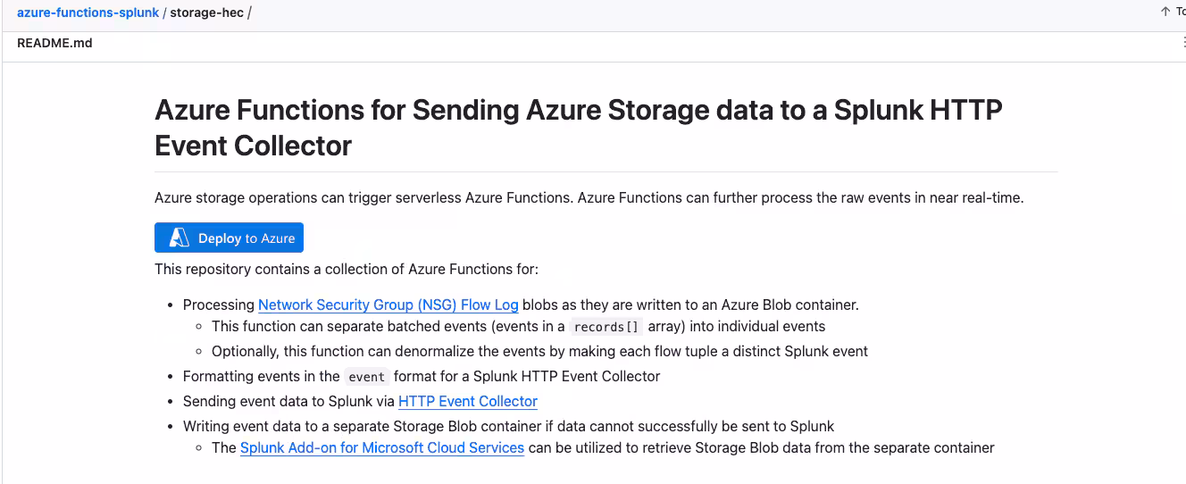 This option deploys an Azure Function from a configurable template, into your Azure Subscription. Its job is to read NSG Flow Logs from your configured storage account, parse the data into clean JSON events and fire the events to a Splunk HEC endpoint.