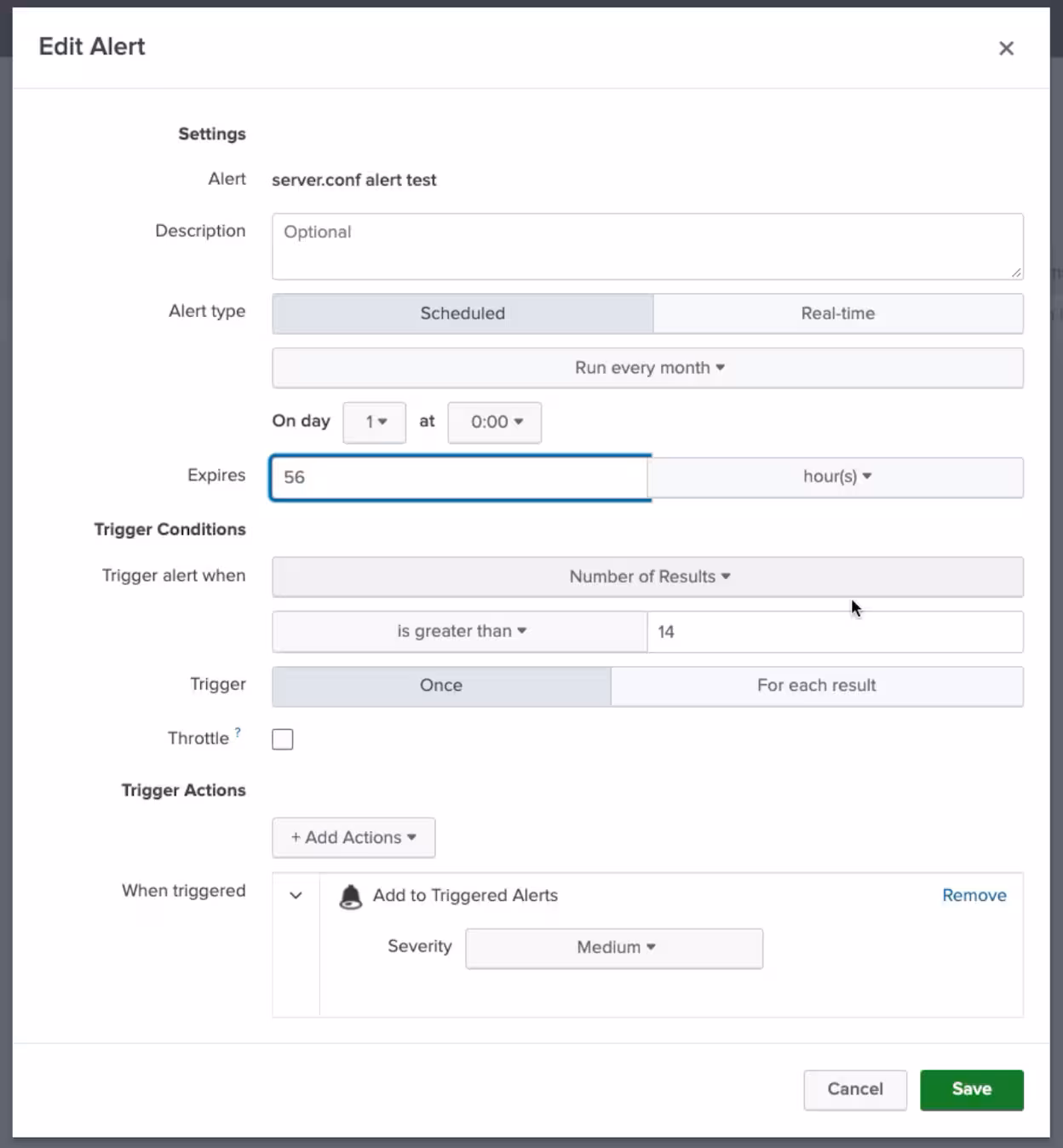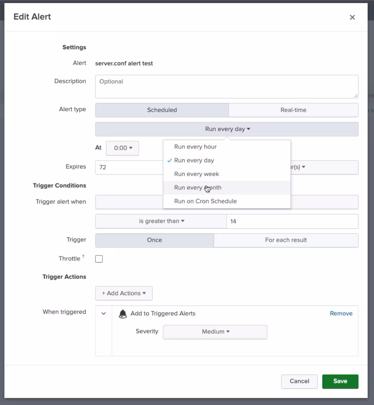 - In the “Search & Reporting” App, navigate to the “Alerts” tab and on an existing alert click Edit > Edit Alert.