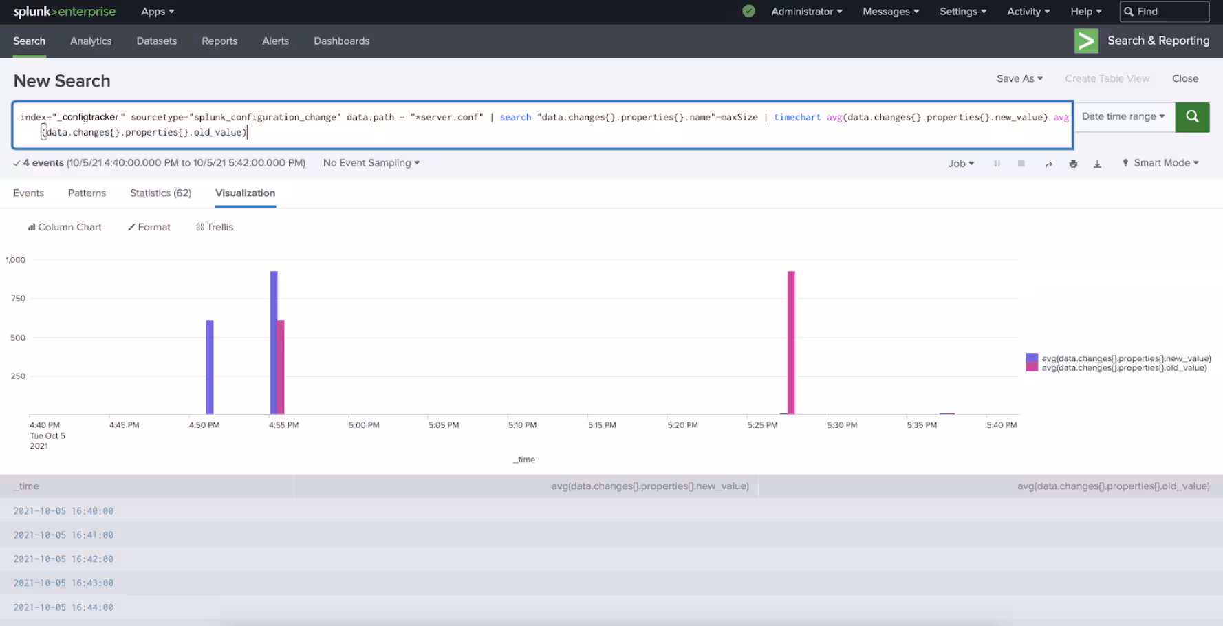 Note: UI changes don’t always map 1-to-1 with .conf file changes. For example a change of certain alert values to 24 hours may show up as null (instead of 24h) in the corresponding .conf file since it is interpreted as a default value in the filesystem. However, the .conf files changes themselves will always show up exactly as they changed in the _configtracker index.