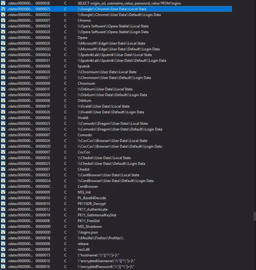 The cred64.dll plugin, on the other hand, focuses on acquiring sensitive information, specifically browser credentials. It targets a variety of browsers such as Chrome, Opera, Sputniklab, Chromium, Comodo, Vivaldi, Orbitum, CocCoc, Chedot, and CentBrowser. By accessing the user profile files associated with these browsers, as shown in Figure 11.1, the plugin aims to crack or decrypt the stored credentials within the compromised host's browsers.