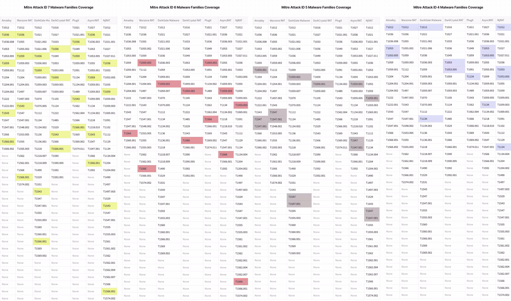 To assist SOC analysts, blue teamers, and security researchers in understanding common MITRE ATT&CK techniques within each malware family, we've grouped all MITRE ATT&CK technique IDs associated with our developed detections. Figures 8.1 and 8.2 reveal similarities and patterns across these techniques, aiding in comprehensive analysis and strategic mitigation efforts.