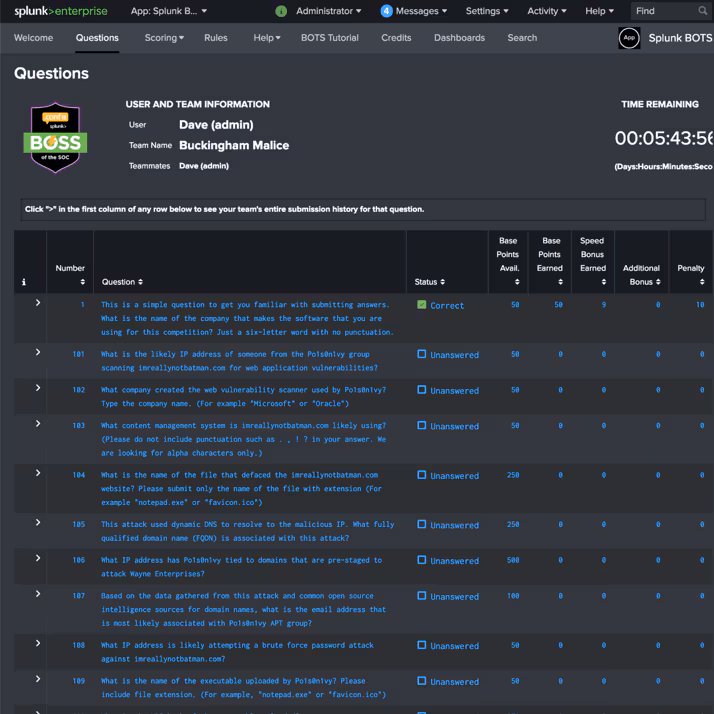 Yep, pretty much. The dataset, scoring apps, and questions are distributed with licenses based on Creative Commons CCO. Of course, you'll need a Splunk Enterprise instance to run all this on. If you have a Splunk license, great! If not, no worries — everything described in this post can be deployed on the free Splunk Enterprise trial version. The dataset is pre-indexed during packaging to avoid data ingest restrictions; packaging data in this way is unconventional, so please read the instructions carefully.