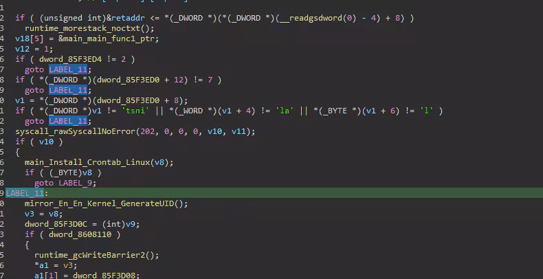 Linux.Gomir generates a unique beacon or infection ID for the compromised host, which it then sends to its Command and Control (C2) server. This beacon ID is created by taking the first 10 characters of the MD5 hash derived from the username and hostname of the infected host. The beacon or infection ID is crucial for the attackers to uniquely identify and manage the compromised machines within their network. Figure 01 shows screenshots of the code that retrieves the username and hostname to generate this beacon ID.