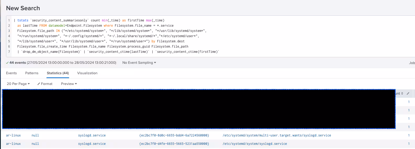 as lastTime FROM datamodel=Endpoint.Filesystem where Filesystem.file_name = *.service Filesystem.file_path IN ("*/etc/systemd/system*", "*/lib/systemd/system*",