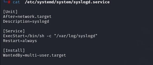Figure 07 shows the content of the .service file created by this malware for the copy of itself named as “syslogd”.