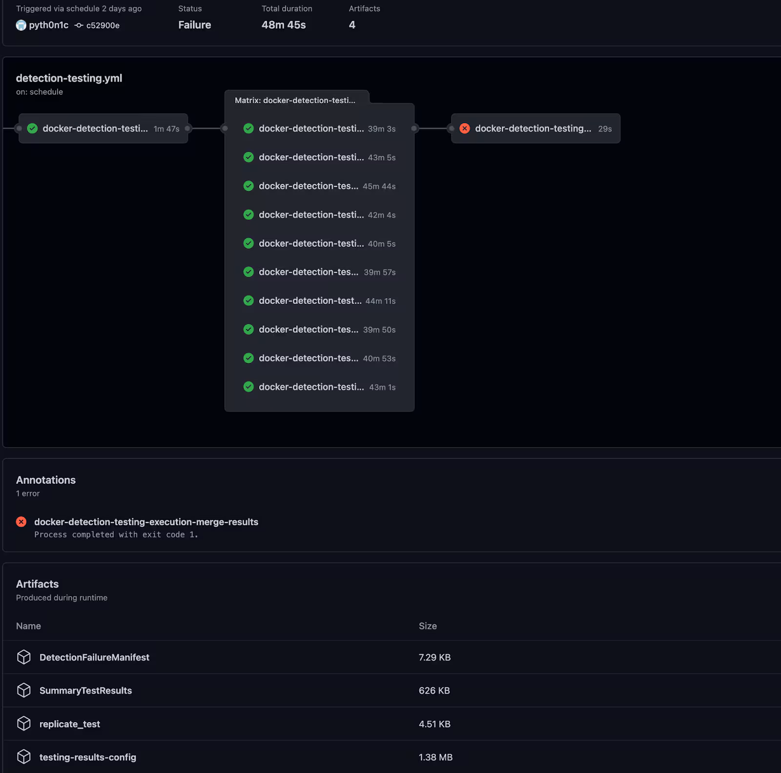 The final GitHub Actions Workflow - 619 detections in under 50 minutes! Notice the presence of the SummaryTestResults and DetectionFailureManifest files