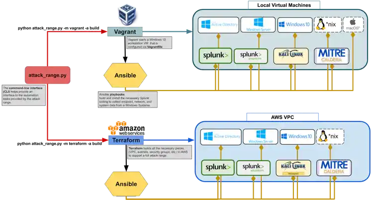 Before we dig into building a range, let's discuss some of the intents of the project and how it is wired together 🔌. More specifically talk about the difference between Vagrant and Terraform mode. The has been built with the intent to automatically 🚀 test the detections of the Splunk Threat Research team and those contributed by the community to the security-content project. The Attack Range project is mainly composed of 3 major parts.