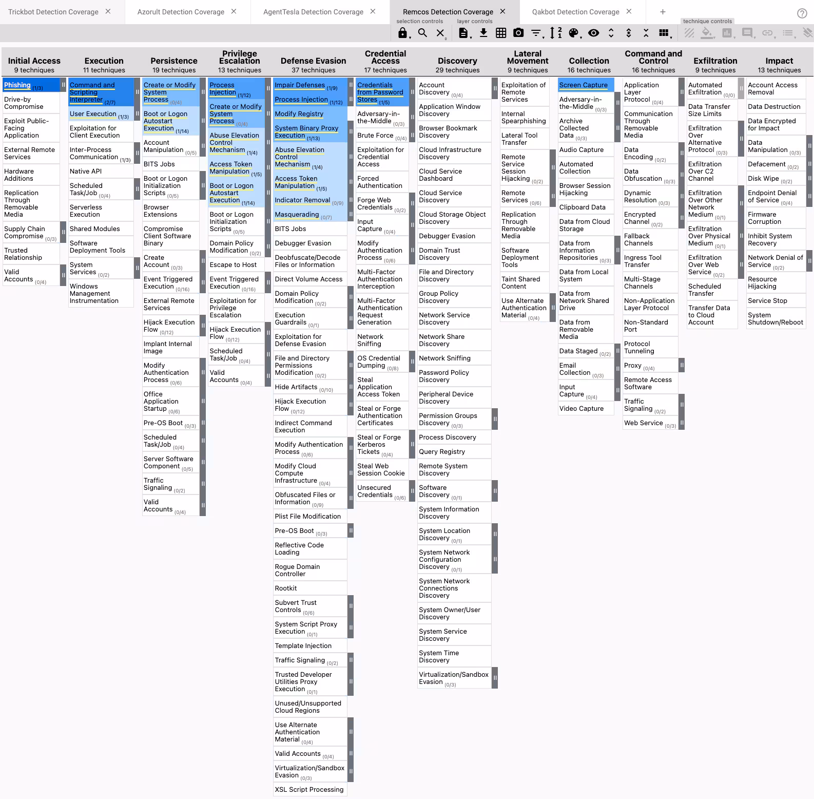 Figure 2 helps to visualize the coverage of techniques that are common across these 5 malware families. We can see that they use the same Defense Evasion techniques like disable or modify security tools (impair defense) and masquerading. In terms of Initial Access tactics, spear phishing attachments are the most common technique and also script execution as part of its malicious behavior.
