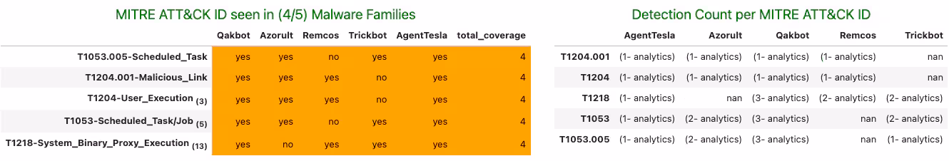 As of the time of writing Splunk provides analytic detection coverage for these 5 malware families with 184 analytic detections. We took these 184 detections and grouped them by MITRE ATT&CK ID to easily identify and visualize commonalities across these malware families.