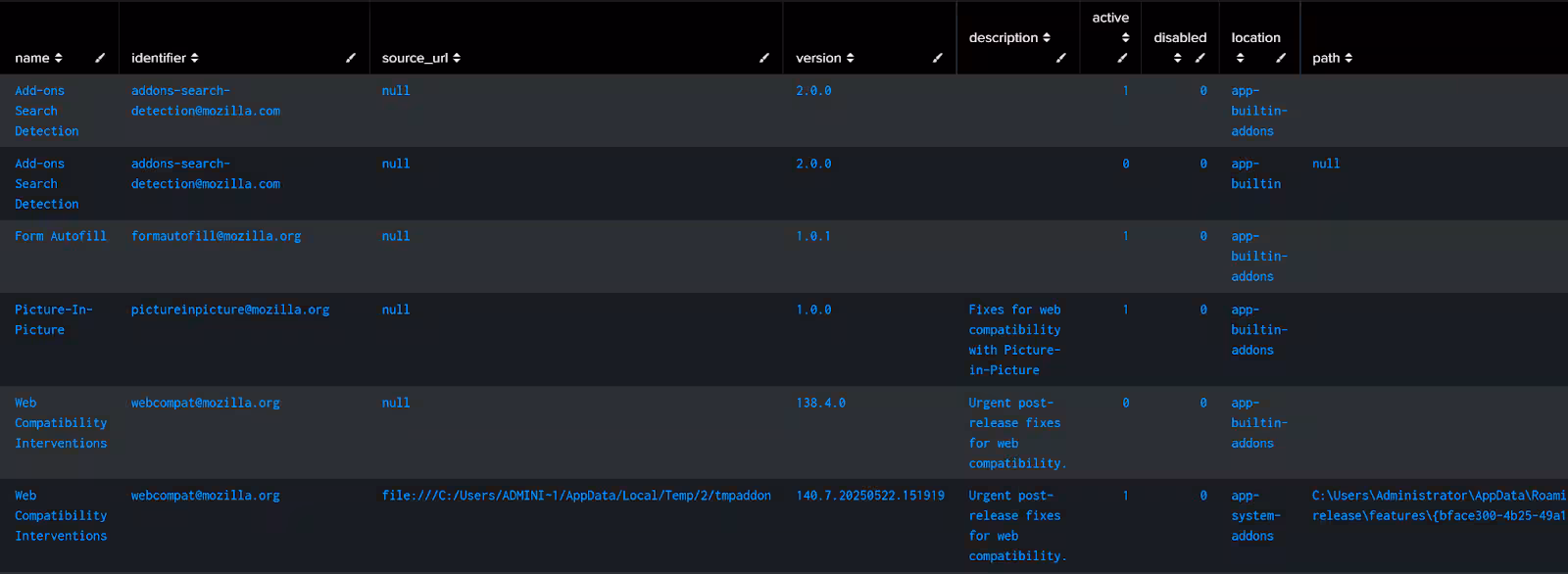 Information contained within this event is aligned with what OSquery offers, for example in the case of firefox addons, we’ll get information about the: “Identifier”, “version”, “source_url”, etc.