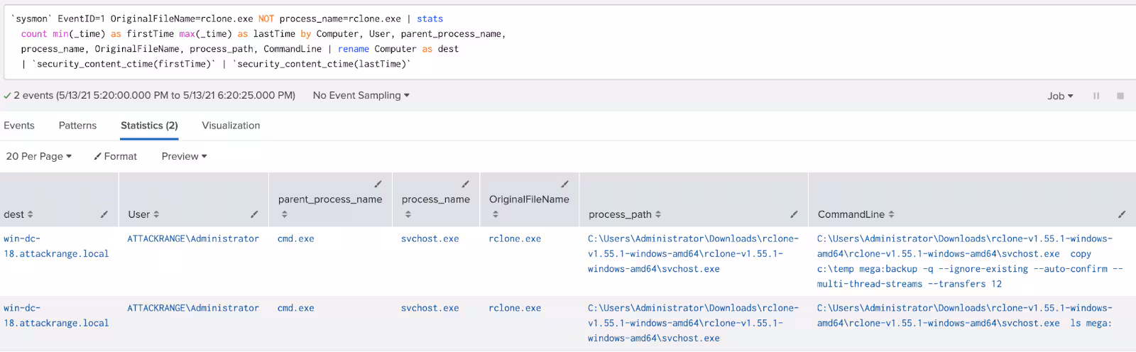 `sysmon` EventID=1 OriginalFileName=rclone.exe NOT process_name=rclone.exe | stats