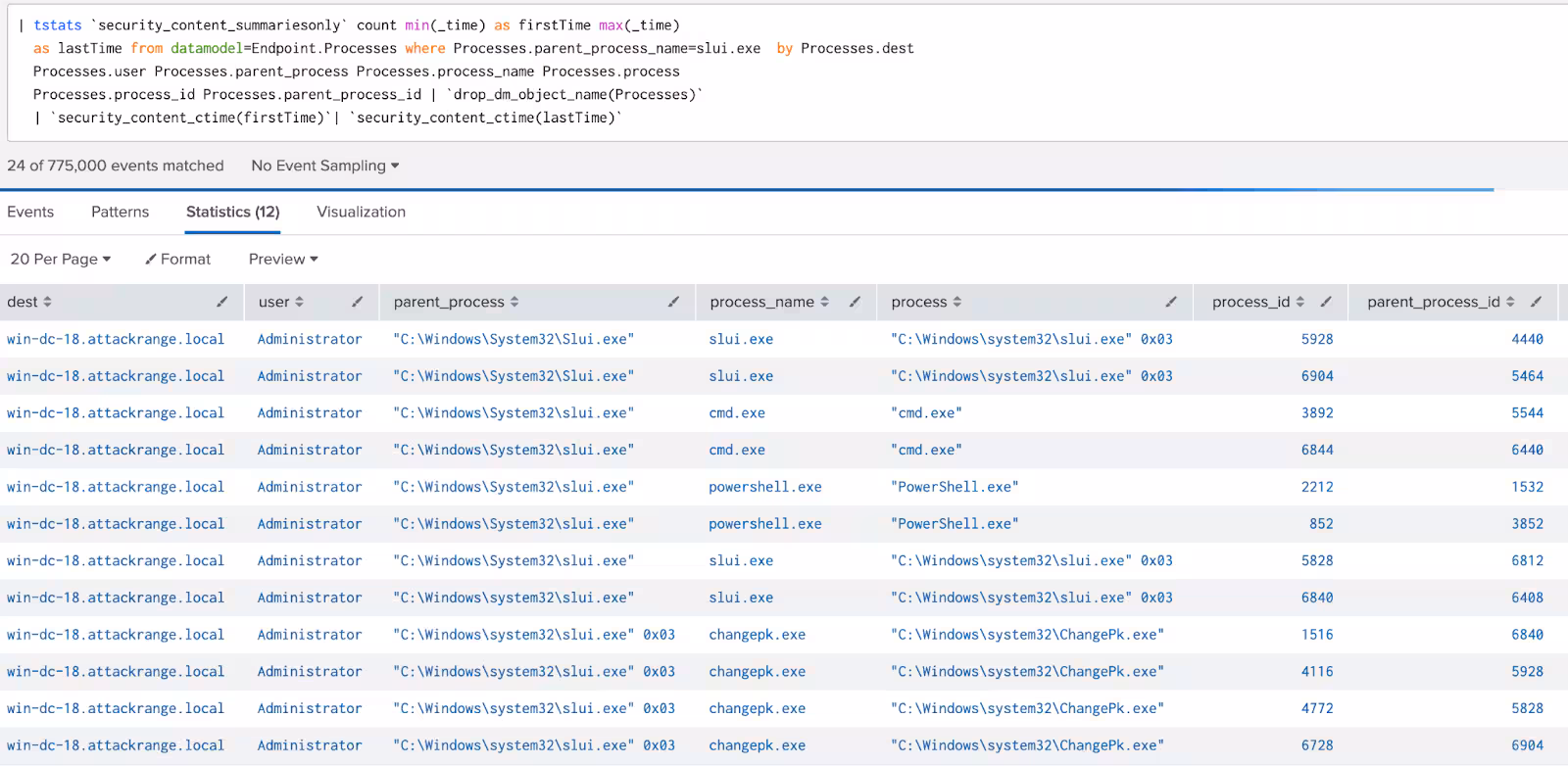 as lastTime from datamodel=Endpoint.Processes where Processes.parent_process_name=slui.exe