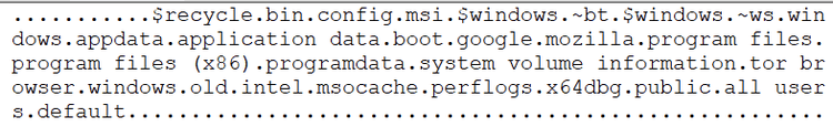 This ransomware payload has a configuration feature consisting of a list of folder names, files, and file extensions it skips during encryption.
