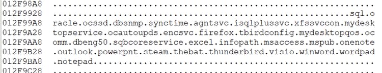 Similar to other ransomware payloads it also tries to kill processes or services that may cause access failure to the files targeted for encryption. Below is the decrypted list of strings related to the process name and service name targeted for termination.