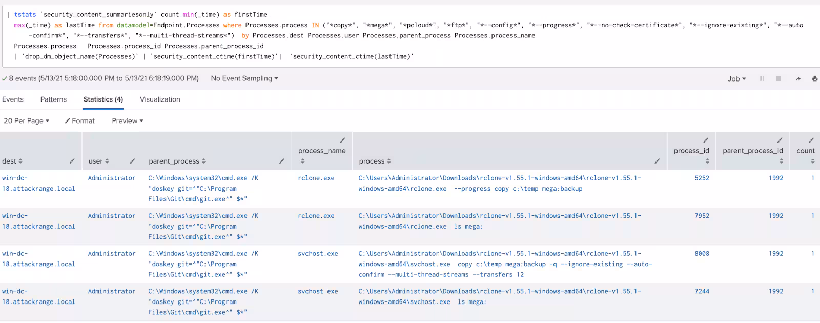 max(_time) as lastTime from datamodel=Endpoint.Processes where Processes.process IN ("*copy*", "*mega*", "*pcloud*", "*ftp*", "*--config*", "*--progress*", "*--no-check-certificate*", "*--ignore-existing*", "*--auto-confirm*", "*--transfers*", "*--multi-thread-streams*")  by Processes.dest Processes.user Processes.parent_process Processes.process_name
