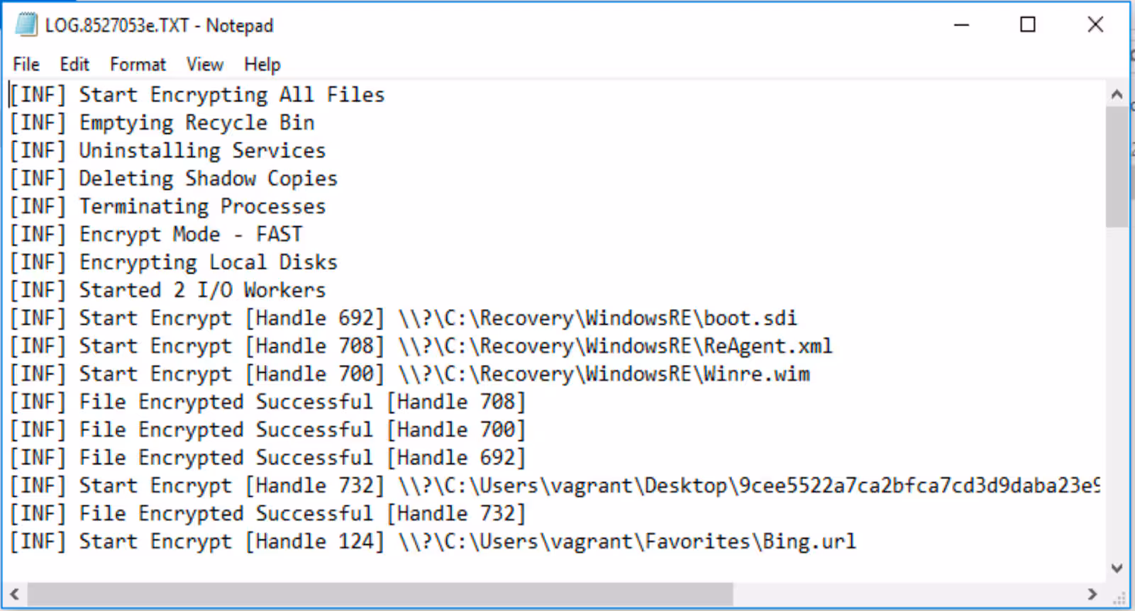 This ransomware payload also includes a log that shows current execution items as the following screenshot shows.