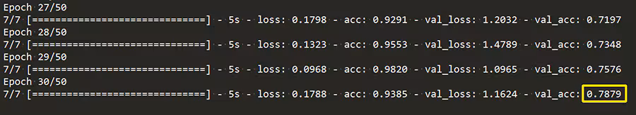With input of total 2,000 images for training and 800 images for validation (1000 + 400 for each class) - it took about 2 minutes for such neural network to be trained to achieve about 81% of validation accuracy: