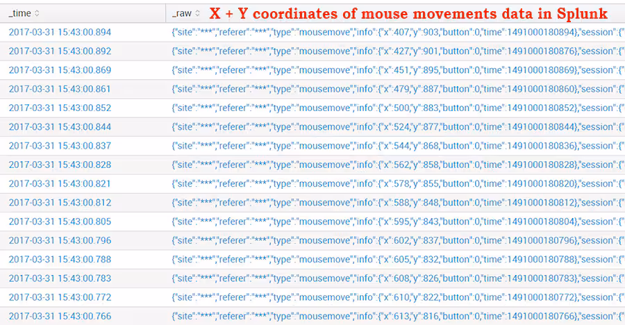 Knowing that each mouse movement generates X and Y coordinates of mouse pointer and also a timestamp - we can collect this data and send it to Splunk to enrich traditional data sources, like clickstream, web and application logs. This way user’s session activity data will also contain information about potentially unique behavior patterns.