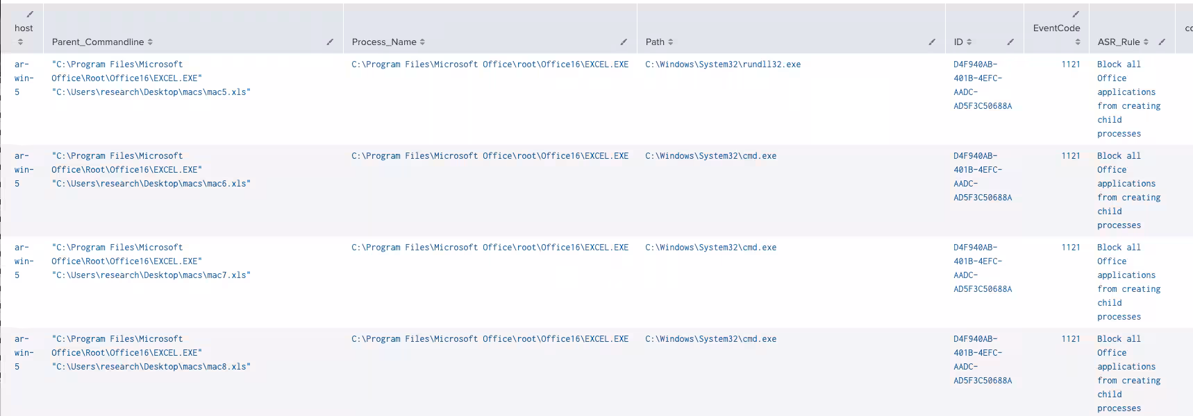 stats count min(_time) as firstTime max(_time) as lastTime by host, Path, Parent_Commandline, Process_Name, ID, EventCode, ASR_Rule