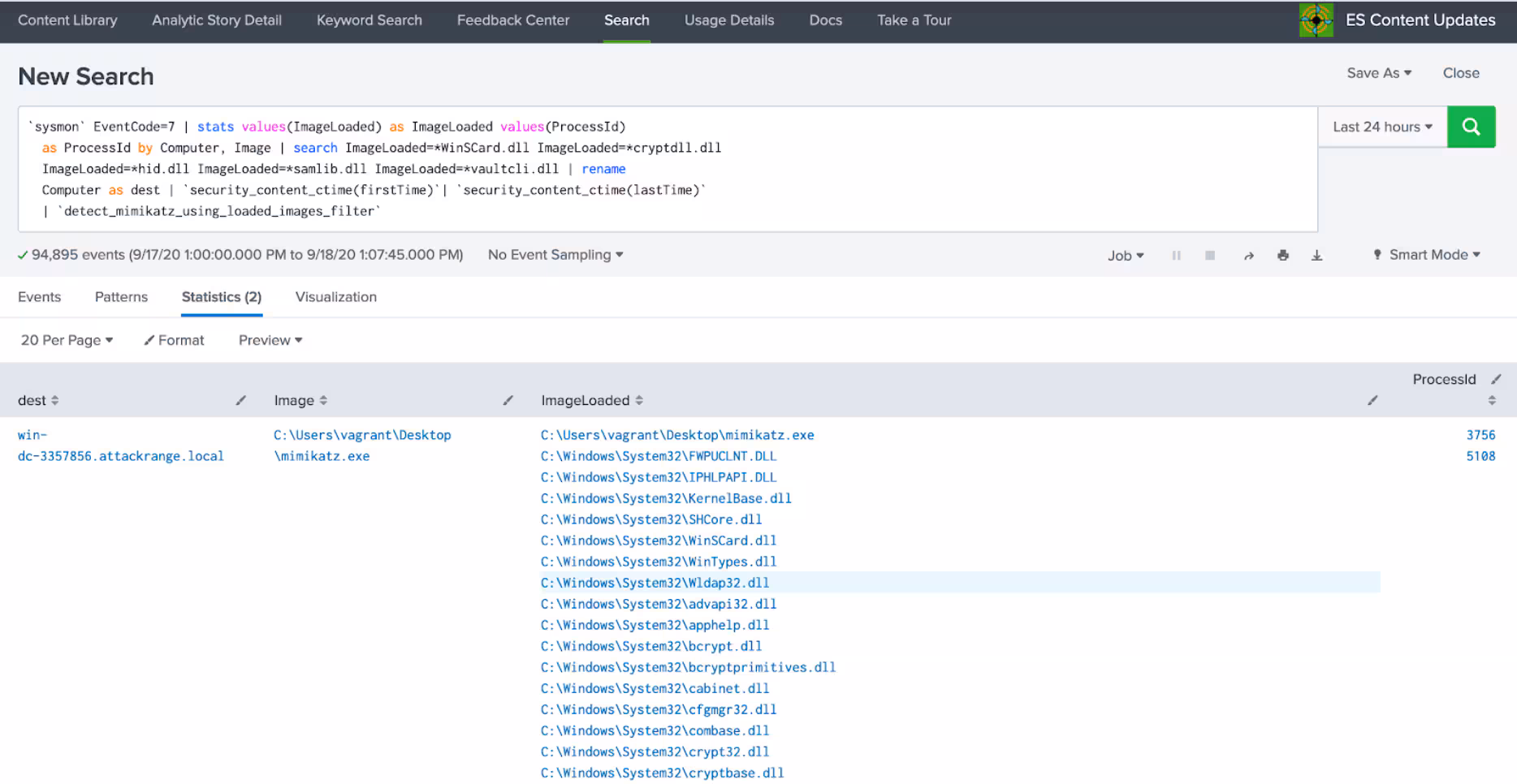 The second detection for finding Mimikatz execution leverages Event Code 7. It is also collected by Sysmon, and to test this detection the Spunk Threat Research team used the SysmonConfig-Verbose.xml verbose logging configuration. Below is a screenshot of the results of the “Detect Mimikatz Using Loaded Images” detection executing from the Splunk server search app.