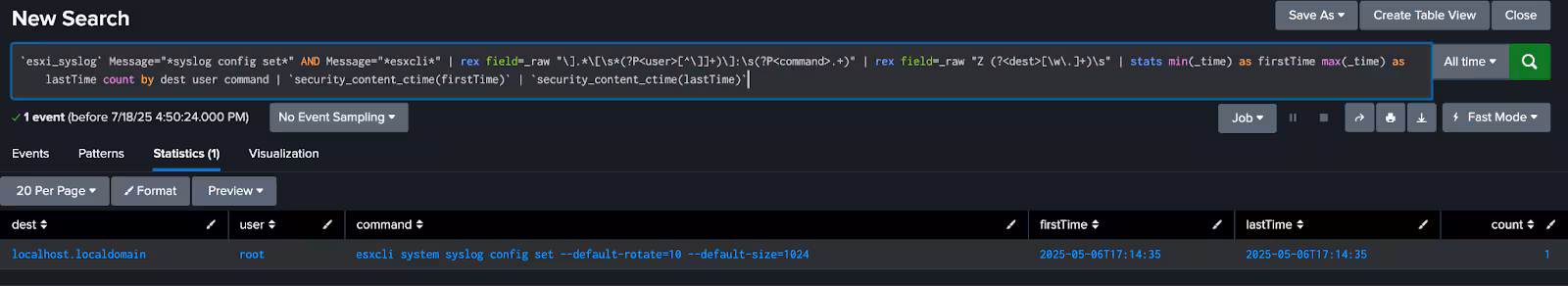 `esxi_syslog` Message="*syslog config set*" AND Message="*esxcli*"