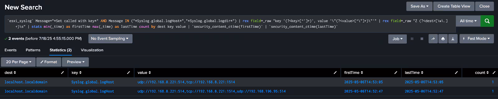 The loghost or logdir keys can also be monitored directly. This detection identifies changes to these configurations on an ESXi host, which may indicate an attempt to disrupt log forwarding and evade detection.