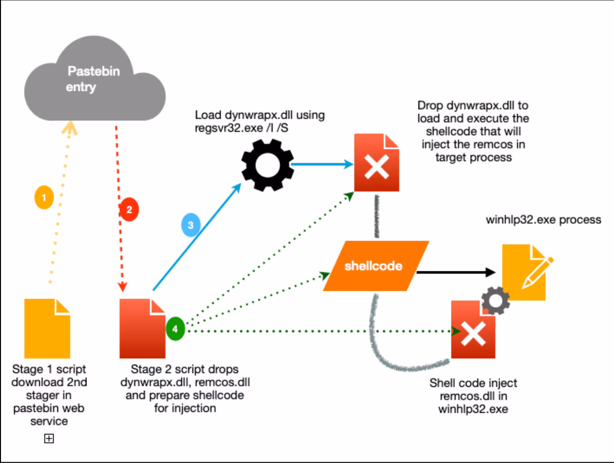 To execute the shellcode for Remcos via process injection, it first decodes and drops “dynwrapx.dll” in the %temp% folder and loads/installs it using Regsvr32 install silent parameter (“regsvr32 /I /S”). This DLL will give the VBScript access to the “DynamicWrapperX'' Object to load 2 more windows DLL modules named user32.dll and kernel32.dll to allocate memory and execute the shellcode.
