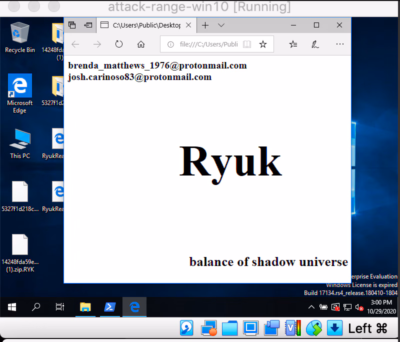 We then proceeded to execute a sample of Ryuk ransomware (14248fda59e7a8bf9f143abe8bbd834cb7c2aa4f) found in the wild and graciously provided to us by Reversing Labs.