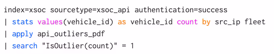 With the base search complete we are going to leverage the Splunk Machine Learning Toolkit (MLTK) and its DensityFunction algorithm to dramatically simplify the development process. We will build a peer group model as it allows us to measure behavior by clustering data based on the class of vehicle. This could be valuable as the volume of API activity may differ across various fleets of vehicles.