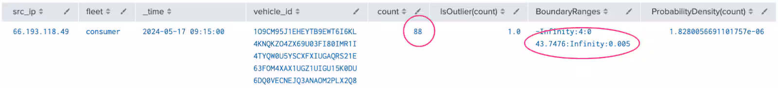 In this example, we see a source IP that issued a strangely high volume of API requests against a number of different vehicle IDs. Notice that the “count” of 88 is greater than the trained “BoundaryRange” of 43.7. Looks suspicious!